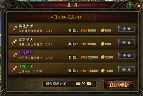 Ø 悬赏大厅30分钟刷新一次,每次随机刷新4个悬赏任务。