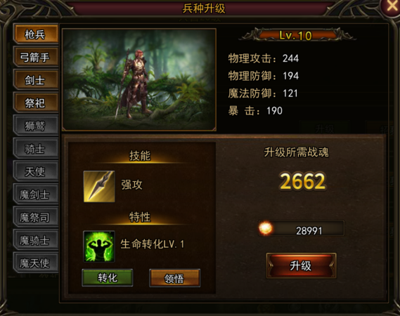 兵营中可招募的兵种有:枪兵、弓手、剑士、祭司、狮鹫、骑士、天使、魔剑士、魔祭司、魔骑士、魔天使,在内城点击兵营,即可看到各类兵种基础属性、技能展示、特性说明、升级消耗。